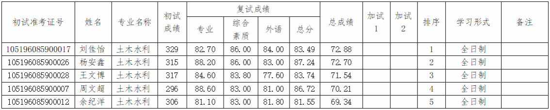 根据教育部、湖北省教育厅的有关文件,依据《湖北文理学院2026年硕士研究生招生复试录取工作方案》,我校于2026年3月26日组织了土木水利专业一志愿上线考生复试,现将5名考生复试成绩公示如下:
